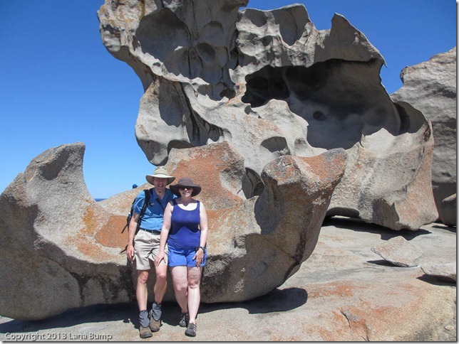 Our next stop was a promontory locally referred to as Remarkable Rocks (we’ve learned Aussies like an alliterative name). As the link indicates, these rocks are interestingly shaped due to their erosion through wind and weather. Very beautiful, although the trip came with warnings about staying away from the edge, complete with the anecdote about someone who didn’t listen, and while she didn’t drown, at least two rescuers, including her guide did drown. Needless to stay we were all careful at the precipice, and probably less willing to help a fool in distress, if it came down to it.